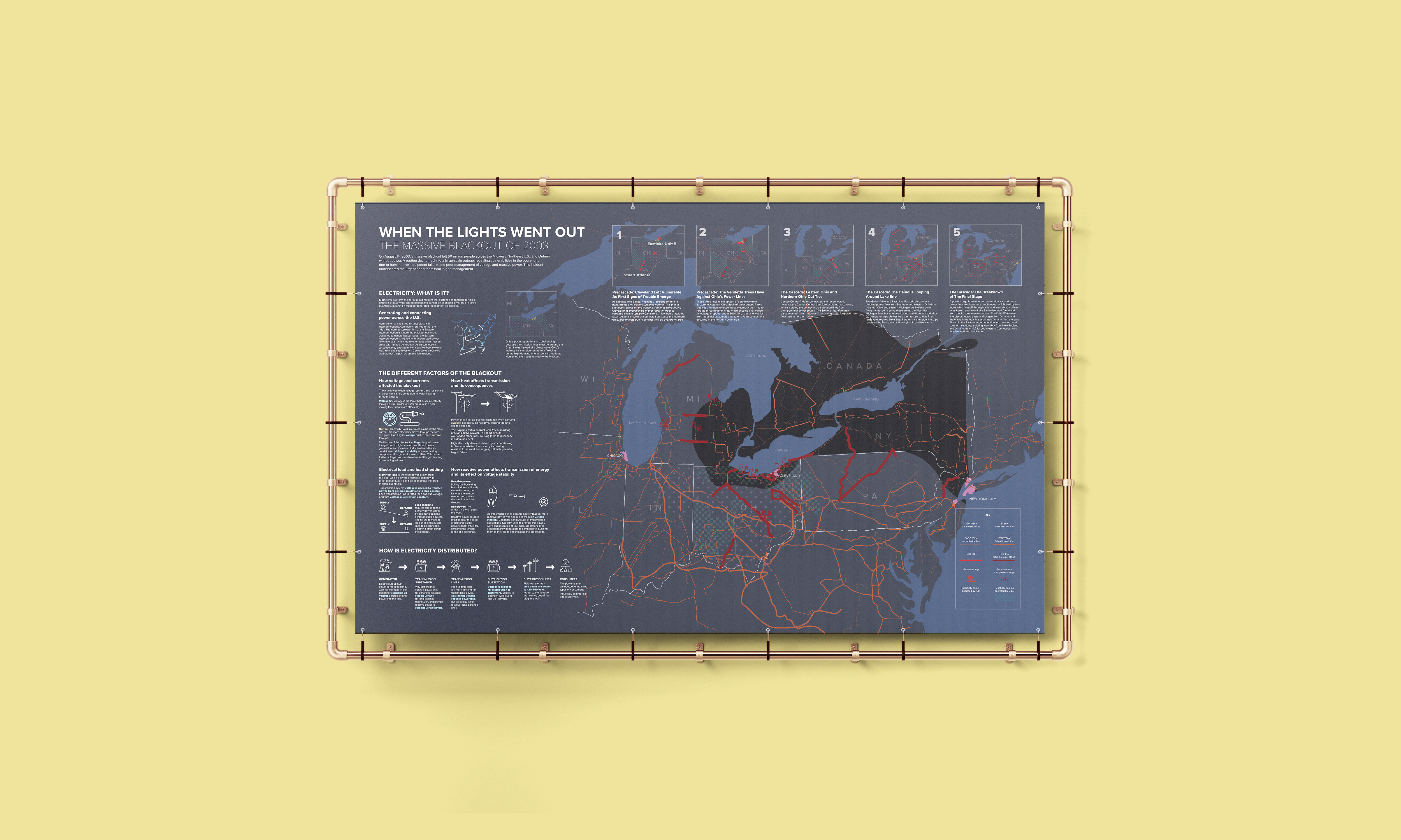 A poster explaining the background behind the 2003 electrical blackout that effected the northeastern US. Created in collaboration with Ashley Kim and Jasmyne Robertson.