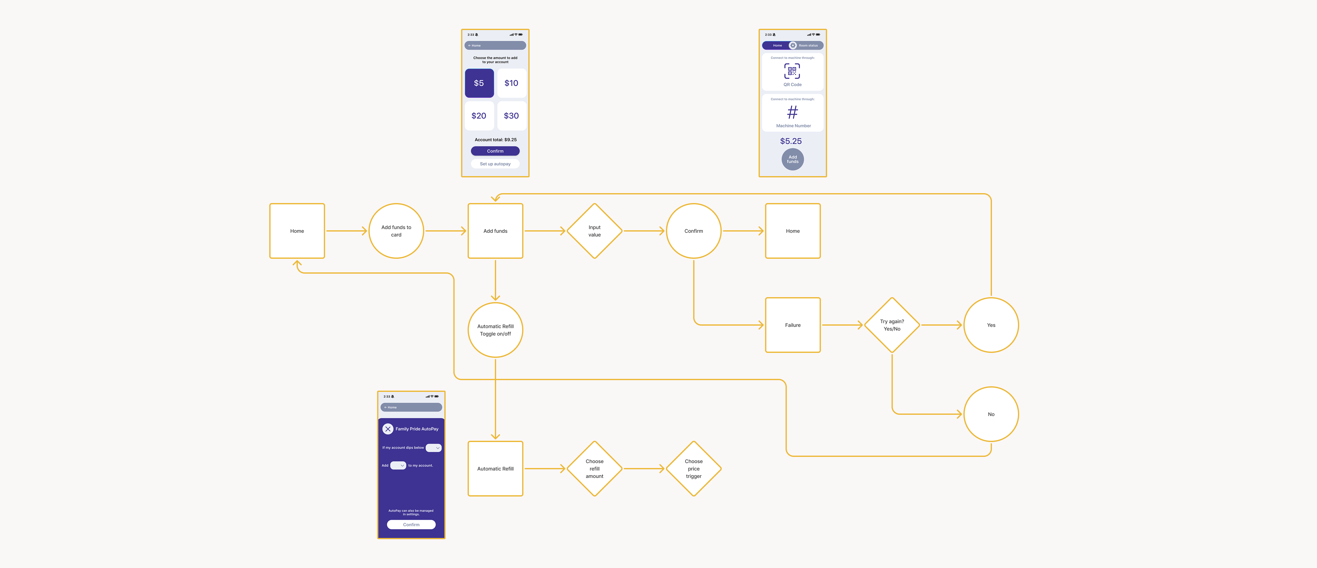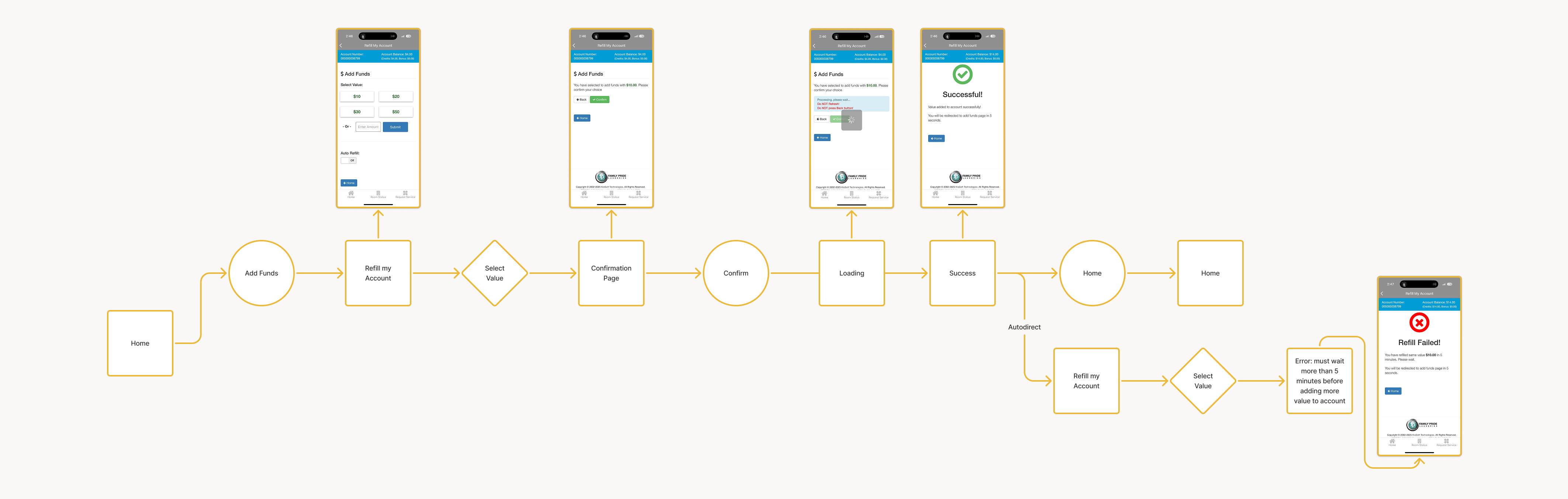 I shortened the process of adding money to the account by prioritizing the fund options and removing the ability to add a custom amount. Choosing the option to set up autopay also opens a popup screen instead of the previous way of text appearing on screen, in order to differentiate it from the normal way of adding funds. After successfully adding funds, users are redirected back to the home screen.