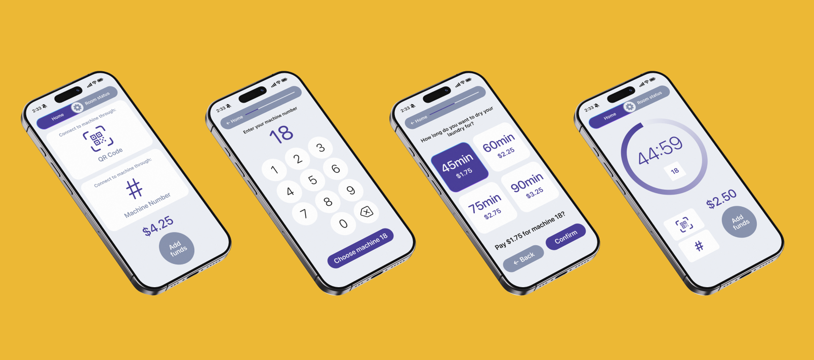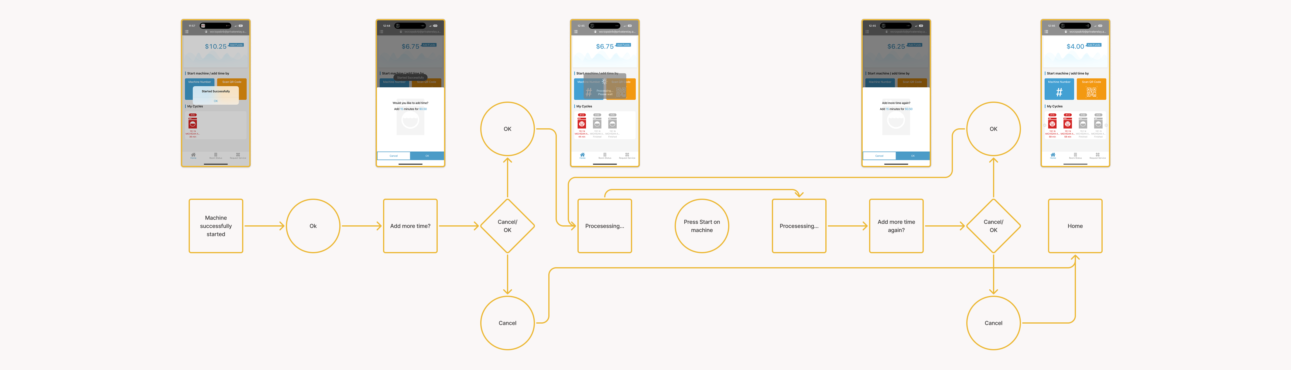 I restructured the process of adding and paying for more drying time. Instead of having to click "more time" and waiting to connect to the machine for every additional 15 minutes, users can now choose from a menu of times to dry, which simplifies the checkout process.