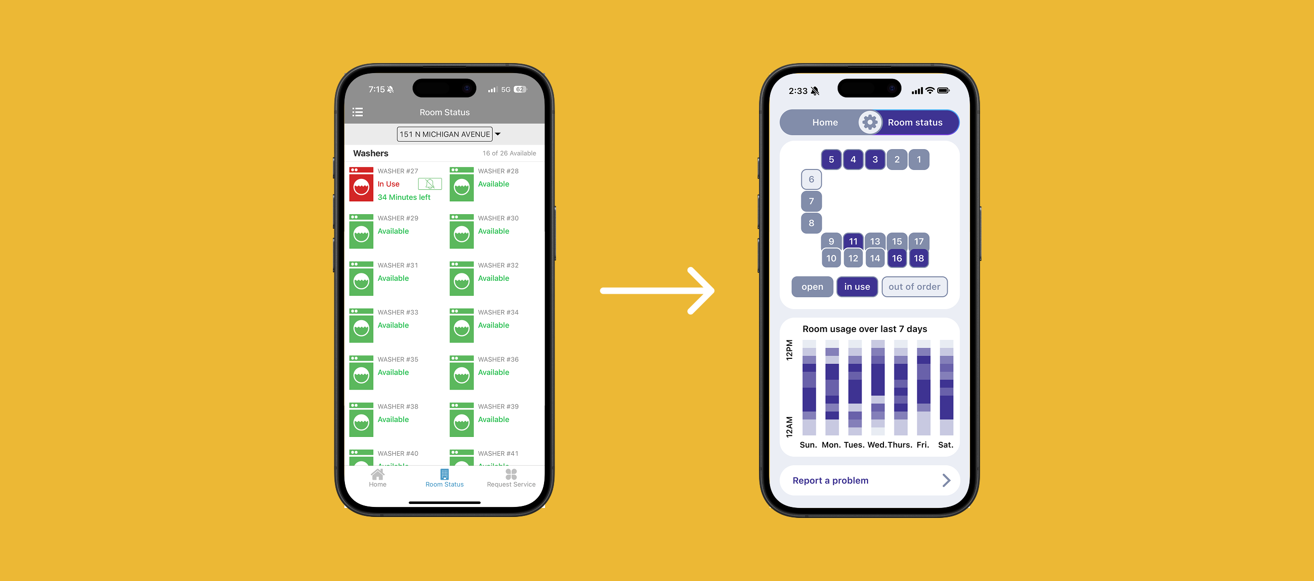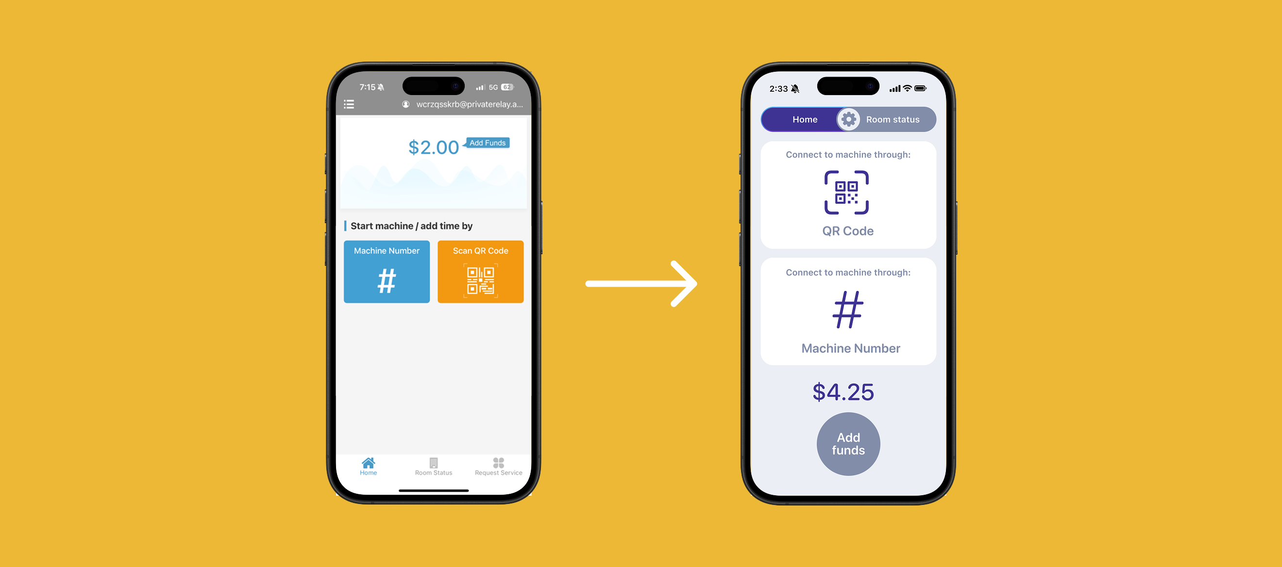 I replaced the main navigation with three sections: home, room status, and settings (which contains most of the options from the hamburger menu). Options to request a refund or to request service on a machine are now located under the Room Status tab.