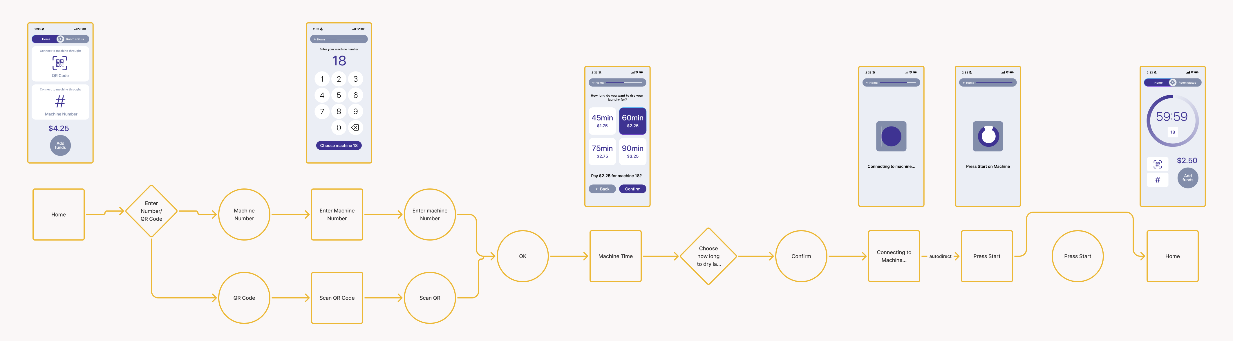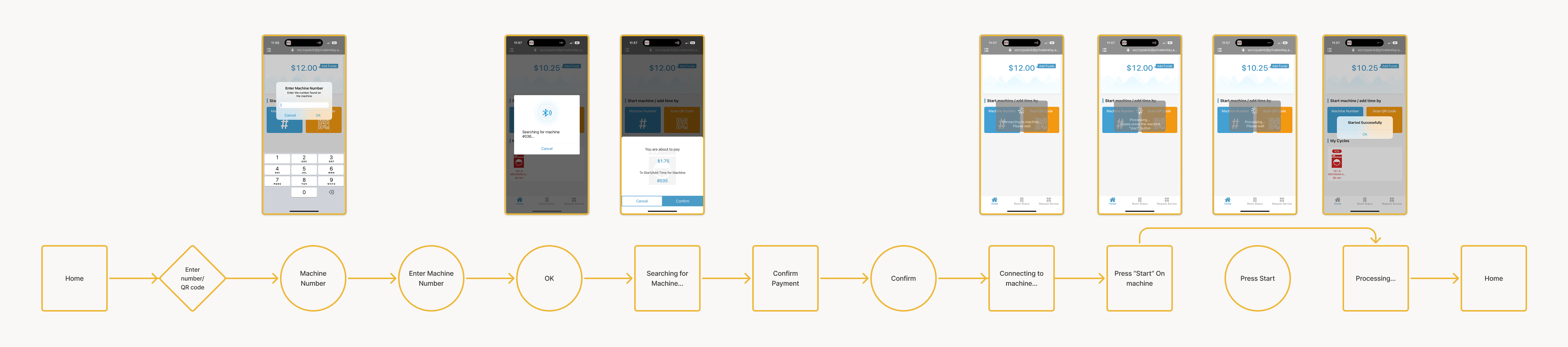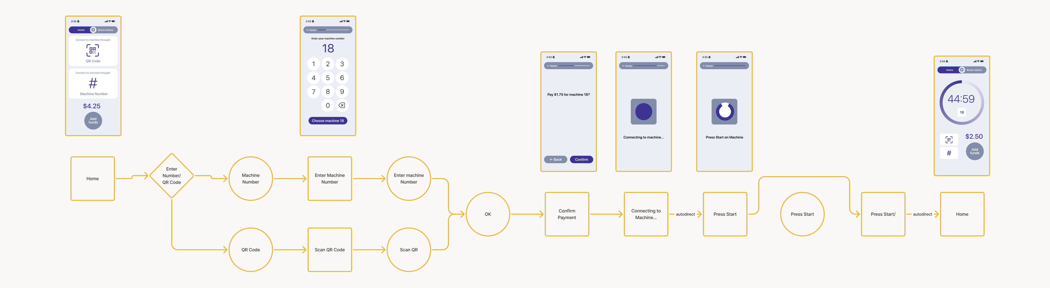 I created new user flows for paying for time, which include only 1 point of connecting to the machine as well as a progress bar for users to see how far along they are in the process of paying for their laundry. During their time connecting to the machine, there is also an animation that plays to entertain the users.